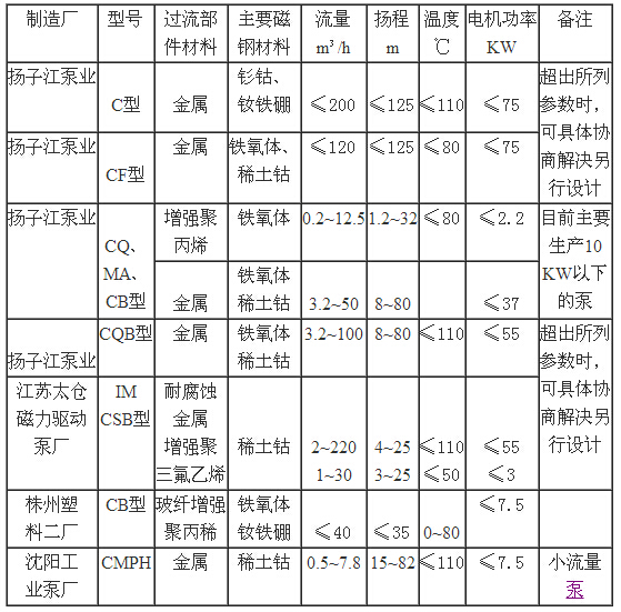 3、目前国内磁力泵制造厂一般均为中、小型厂,开发和研制手段较为薄弱。对超出产品参数范围的泵,一般不宜委托生产厂研制或开发,以保证工程质量和进度。国内主要磁力泵制造厂及其产品见表1—1。